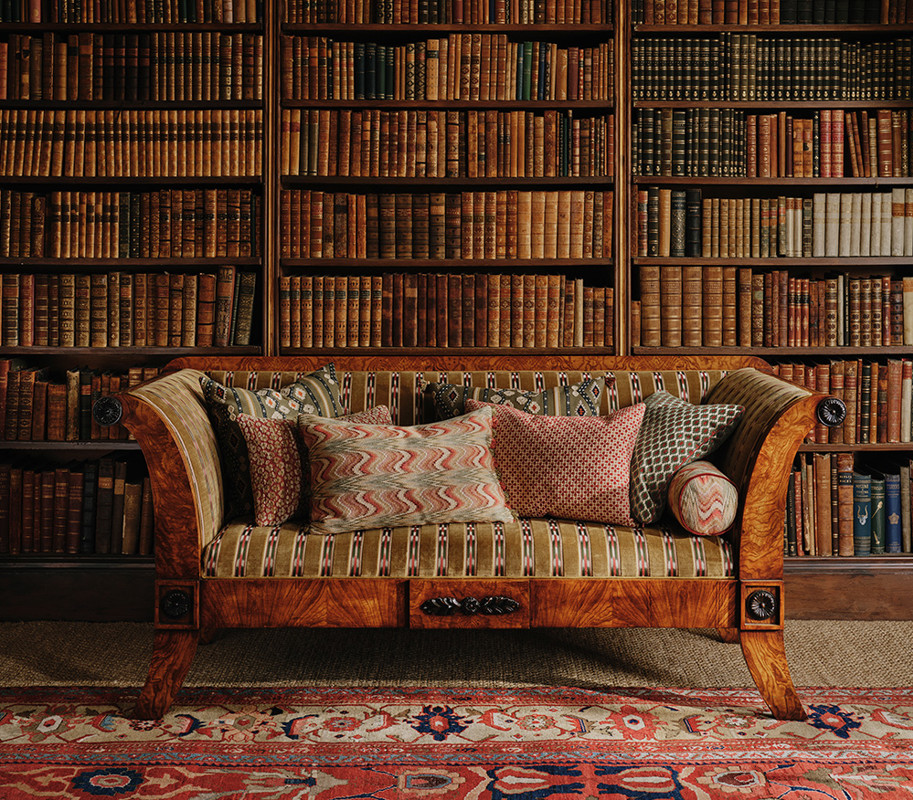Each textile tells a story of craftsmanship and heritage, drawing from the past to create a sense of comfort and continuity. Depth of colour and texture plays against the rich architecture of the room, inviting reflection and repose.
