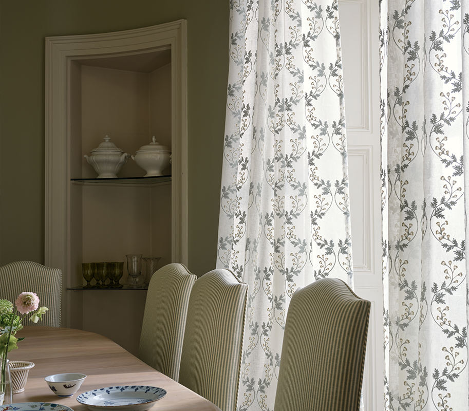 The signature fabrics in the Tilbury collection are complemented by a broad selection of tonally embroidered sheers, long a hallmark of the Colefax and Fowler range including corded appliqué and other intricate stitchwork. These come in a variety of delicate hues and designs, featuring small-scale leaves, ogees, and finely detailed stripes.
