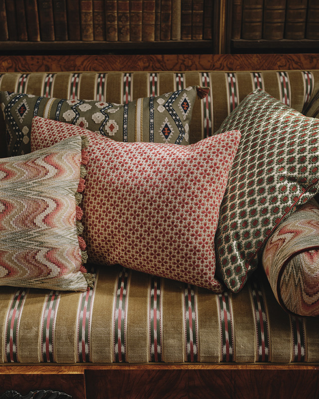 In this richly layered library, pattern takes centre stage. The distinctive flamestitch design, Dexter, introduces a sense of movement and energy, beautifully balanced by the softness of silks, weaves and the indulgent richness of velvets.